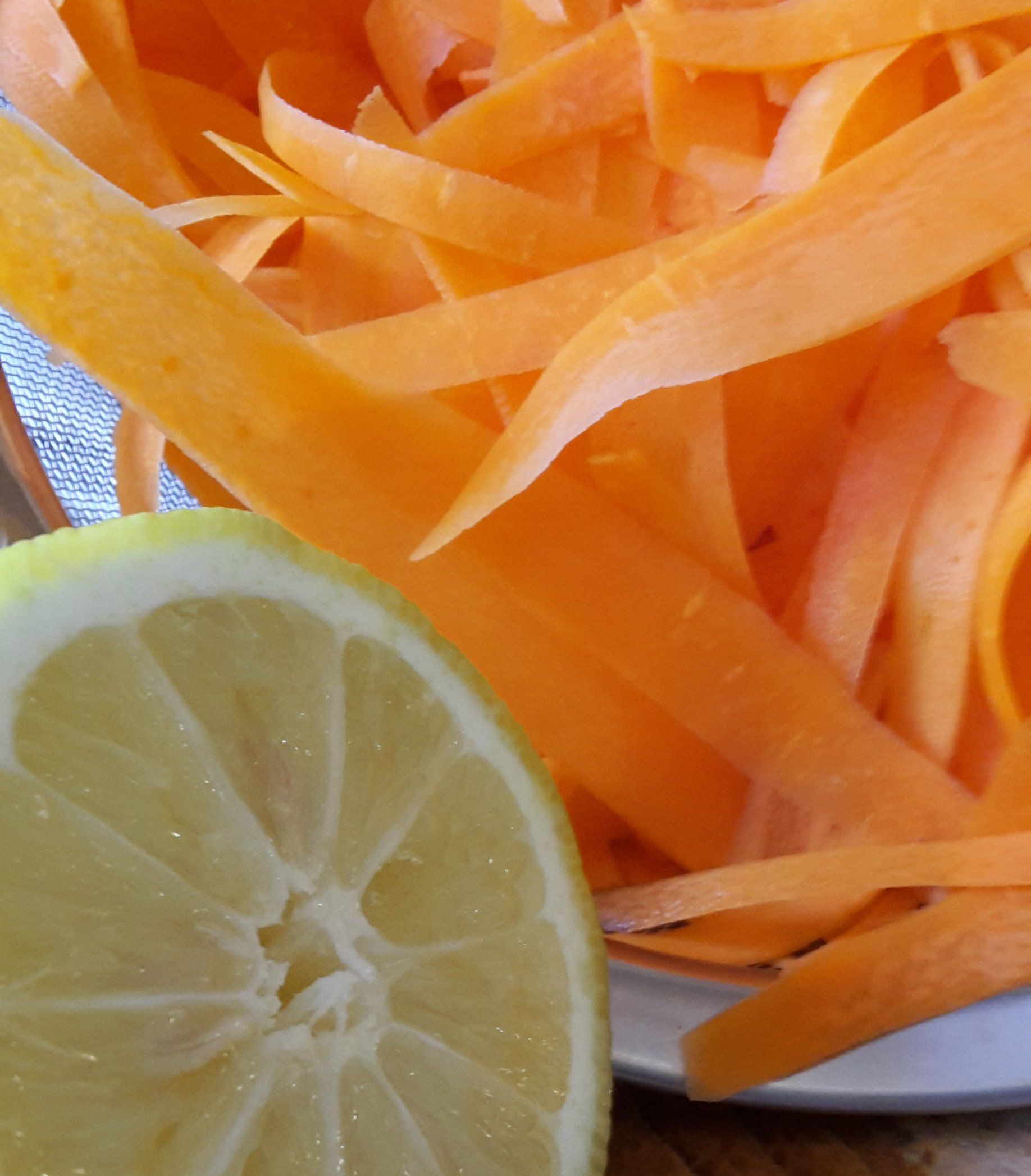 - Die Karotten schälen, dann mit dem Schäler in Längsstreifen schneiden.