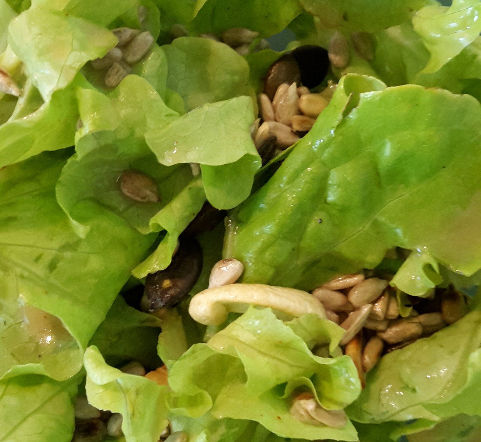 Grüner Salat mit Lieblingsdressing und einer Prise geröstete Saaten