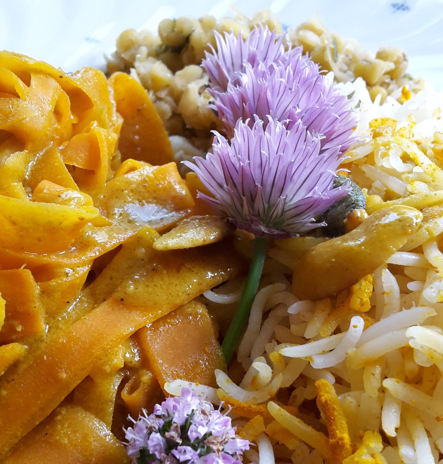 - Anrichten und das Gericht mit Gewürzblüten je nach Jahreszeit garnieren. Kapha-Konstitutionen können die Mahlzeit gerne noch mit einer Extraprise Chili versehen.