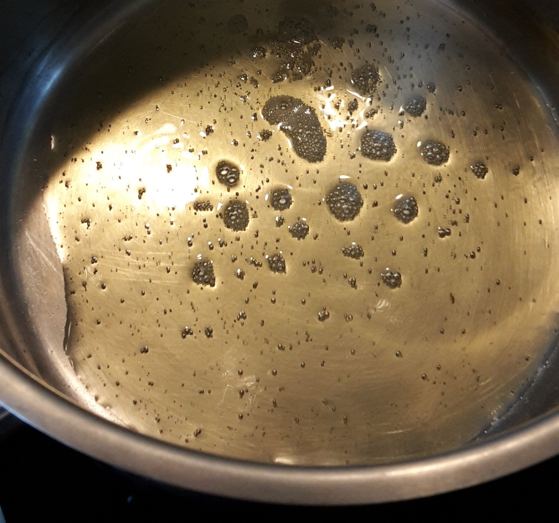 - Inzwischen den Topf innen trocknen und 1 - 2 EL Pflanzenöl oder Ghee hineingeben und gut erhitzen (z.B. bei 9 Stufen ruhig auf 7 - 8 stellen).