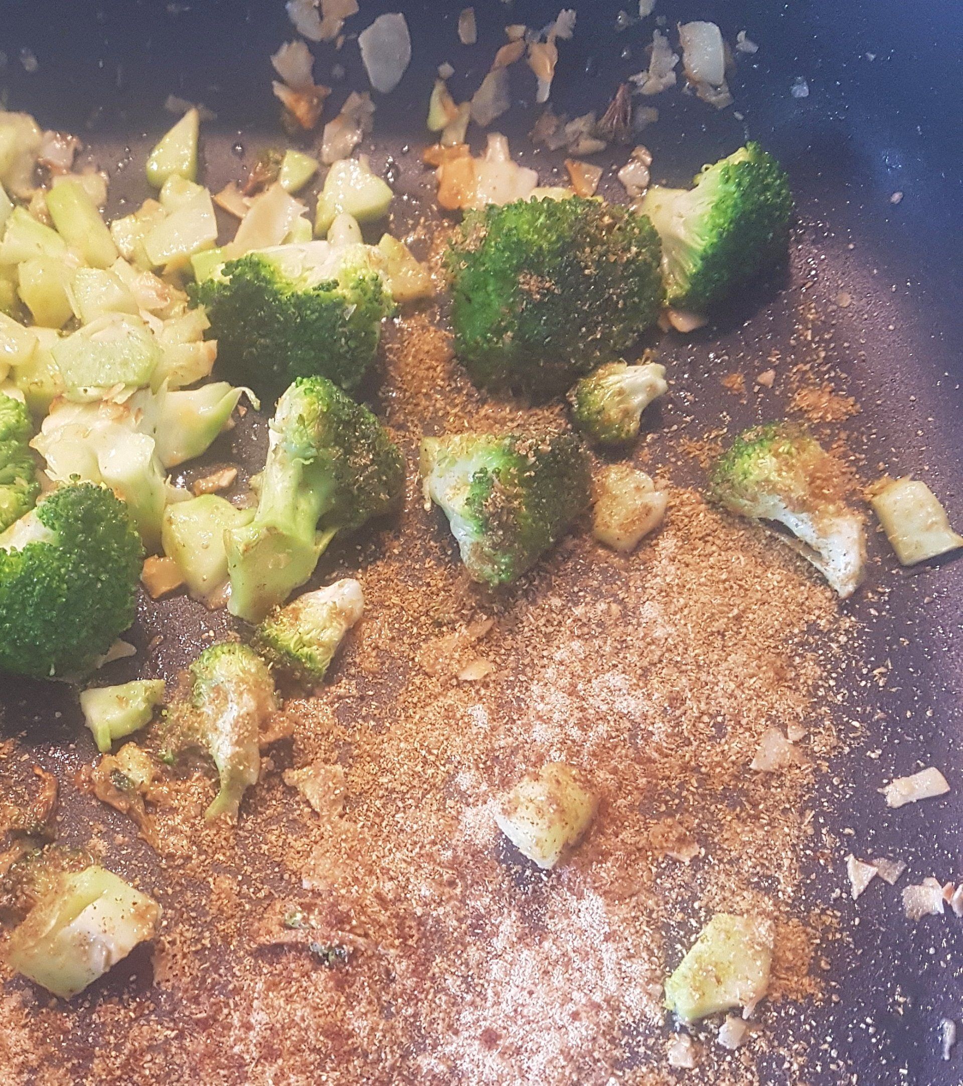 - Das Kokosfett in einer Pfanne schmelzen, die Brokkoliteile zugeben, kurz anbraten, dann Koriander, Kardamom, Nelke zugeben, kurz mitbraten, bis der würzige Duft aufsteigt.