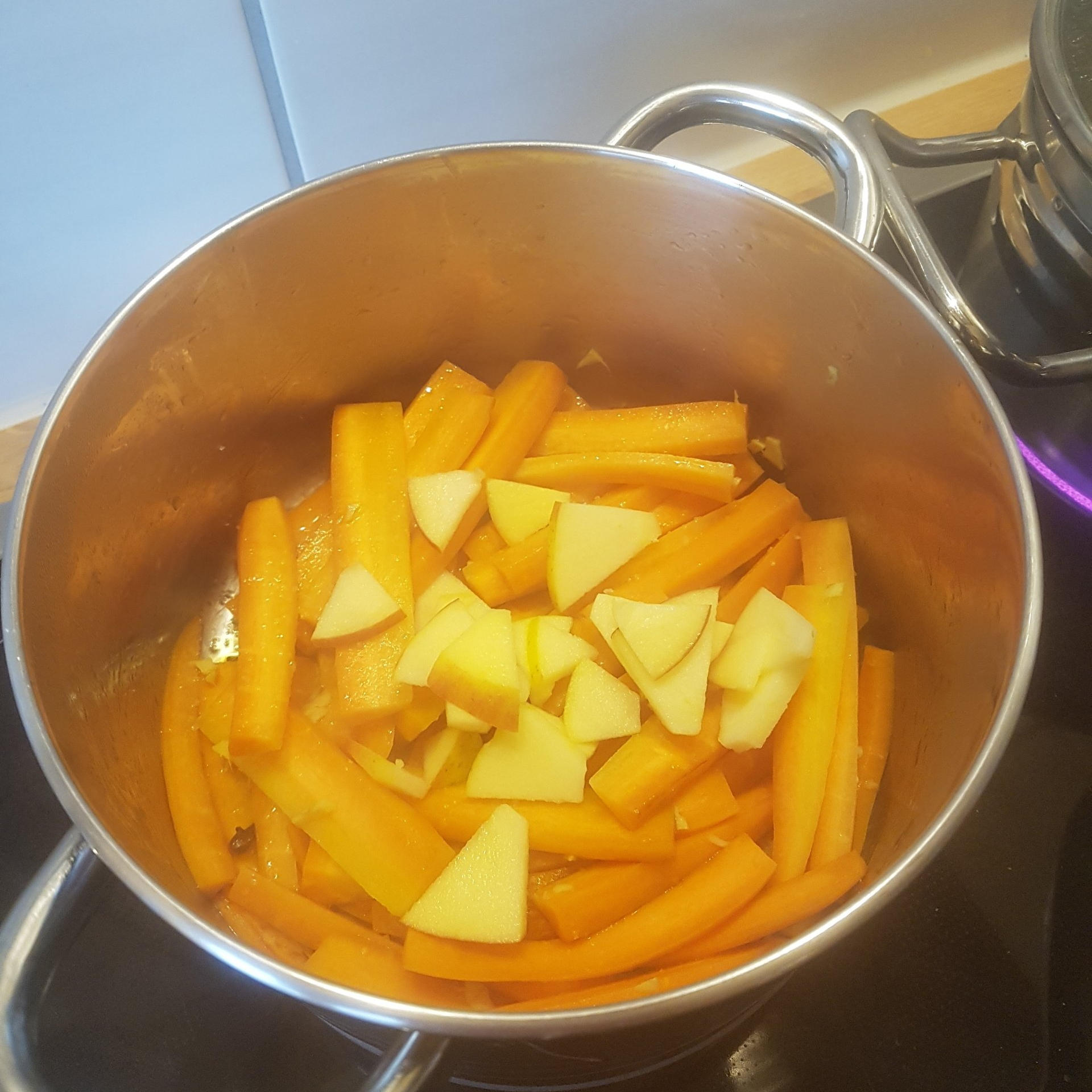 - Mit Kurkuma überstäuben und gleich die Möhrenspalten und Apfelschnitze dazu.
