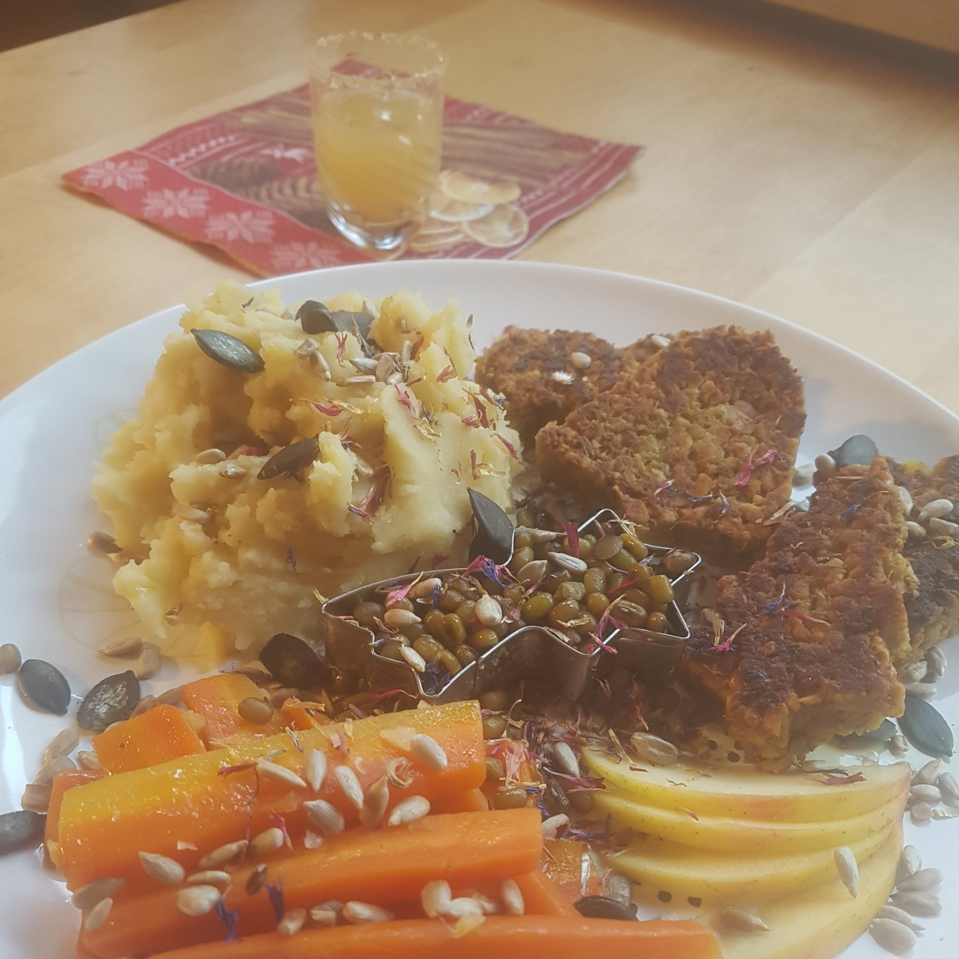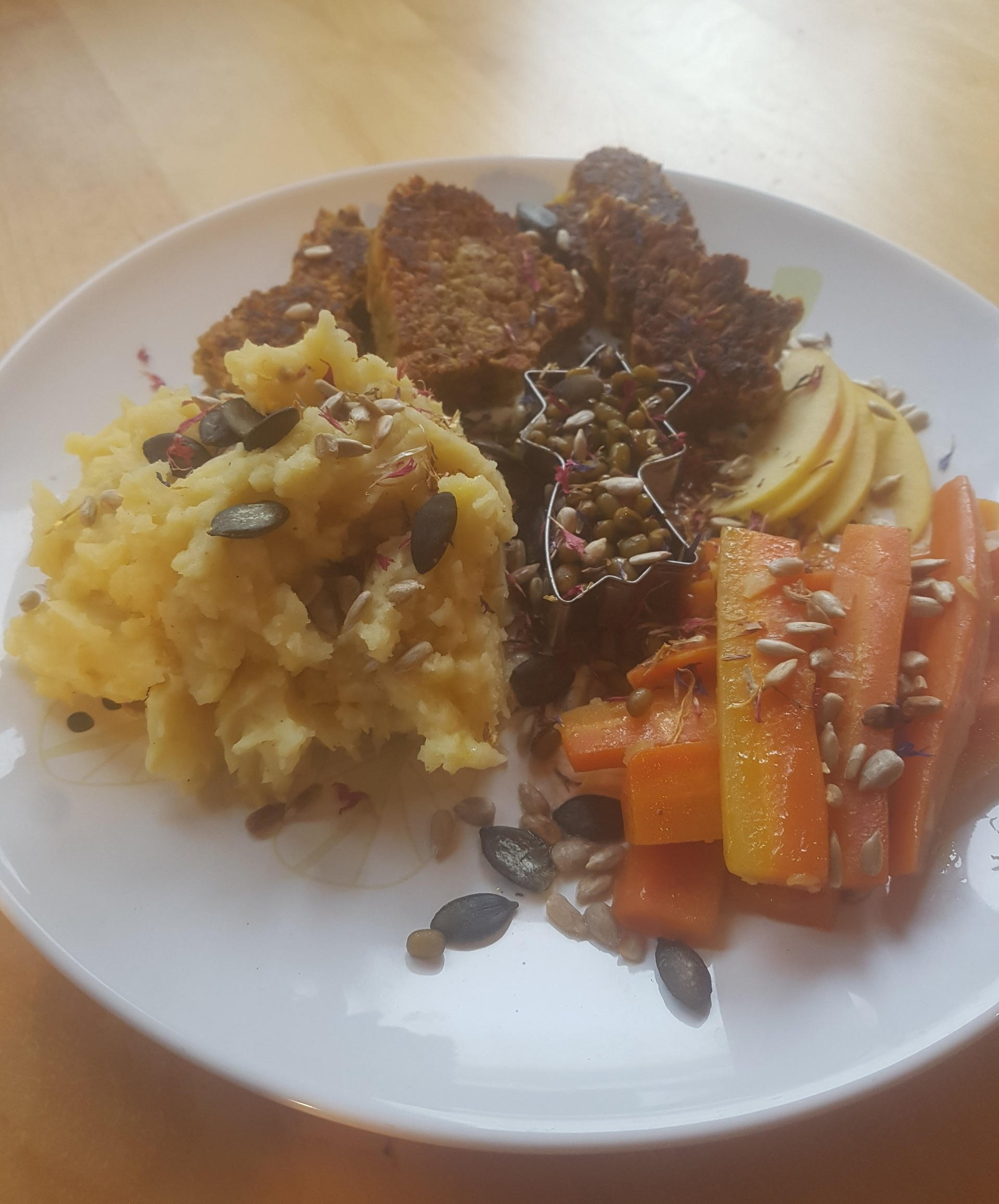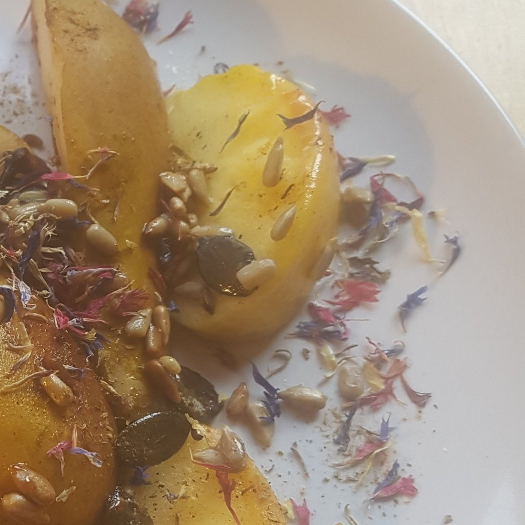 Das Abschmecken der Friends nicht vergessen, dann alles miteinander anrichten, garnieren z.B. mit frischen Apfelspalten, gerösteten Saaten und getrockneten bunten Blüten.